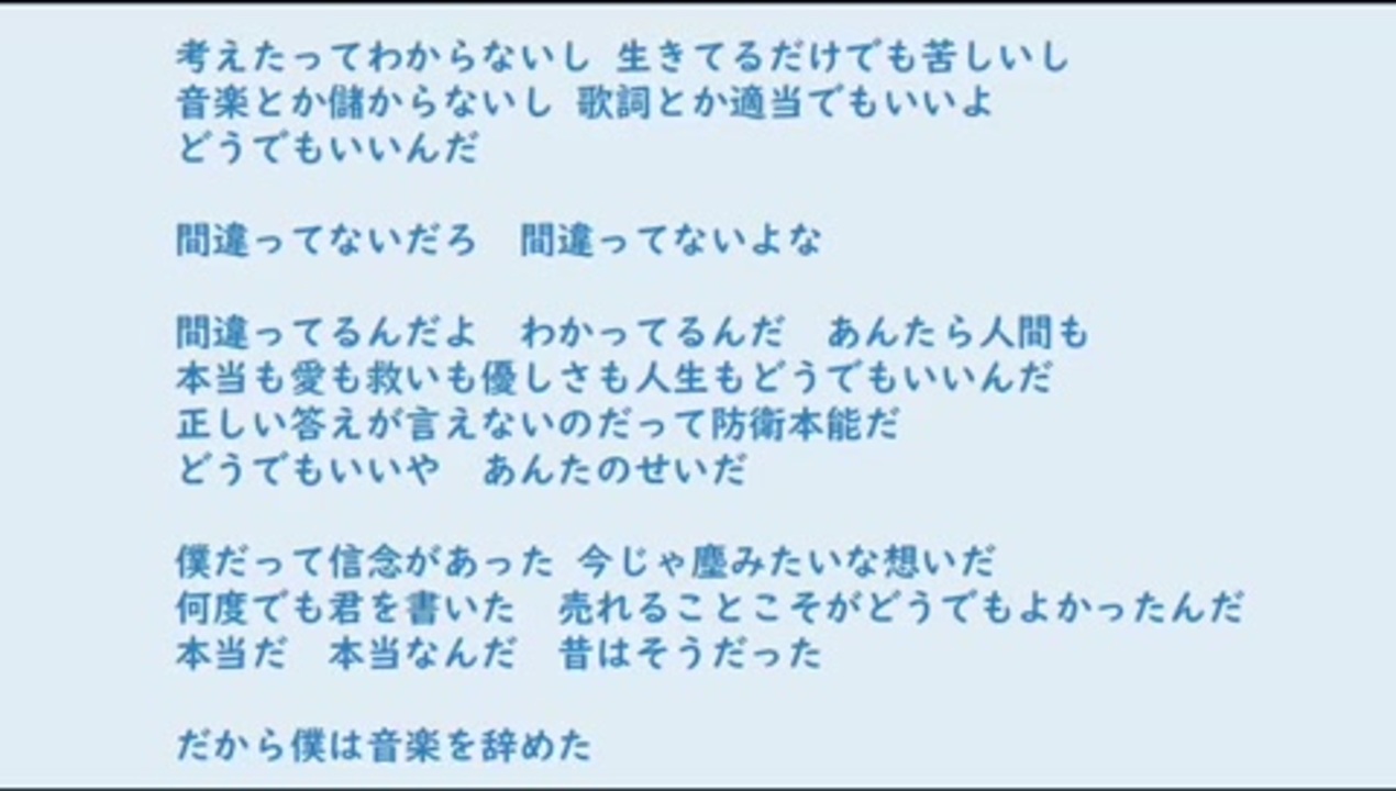 ã¨ã«ã·ã« ã¢ã«ãã è¡¨é¡æ² ã ããåã¯é³æ¥½ã'è¾ãã Mvå ¬é Okmusic from c.okmusic.jp 竈門炭治郎のうた theカラオケ バトル二冠 ミュージカル女優が本気で歌ってみた 中村萌子 鬼滅の刃 kamado tanjirou no uta with full lyrics. Exit tunes presents vocalostream feat.初音ミク. Hatsune miku 10th anniversary album 「re:start」 (album). 今回はヨルシカの曲「だから僕は音楽を辞めた」(that's why i gave up on music)を弾かせて頂きました! Yorushika (ヨルシカ) is a japanese rock duo founded in 2017 represented by universal music japan. ヨルシカ / だから僕は音楽を辞めた(covered by コバソロ & こぴ). Перевод контекст そのため c японский на русский от reverso context: だから僕は音楽を辞めた (dakara boku wa ongaku wo yameta, 그래서 나는 음악을 그만두었다).