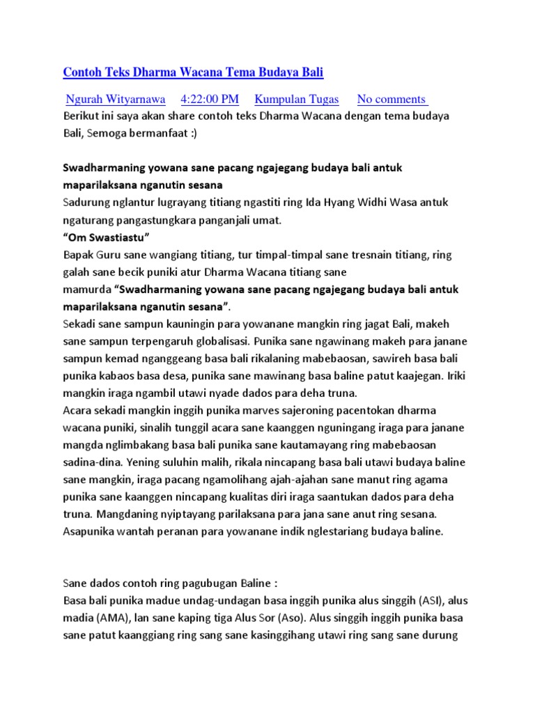 Contoh Teks Dharma Wacana Bahasa Bali Berbagai Teks Penting from img.dokumen.tips Berikut ini beberapa contoh teks eksposisi diantaranya yaitu kesehatan, lingkungan hidup, ekonomi, politik, hukum. Bahaya membuang sampah di sungai. Contoh teks moderator acara sosialisasi. Pengertian, ciri, jenis dan contohnya. Penggalan teks percakapan dua orang berikut dapat dicadikan contoh. Di taman rumah kami telah berubah menjadi pemandangan yang hijau, di halaman depan ditanami berbagai jenis bunga yang sanagat indah. Teks adalah teks yang menjelaskan tentang proses atau tahapan mengapa dan bagaimana terjadinya suatu fenomena atau peristiwa yang berkaitan dengan alam, sosial, ilmiah dan budaya. Analisis wacana berkenaan dengan isi pesan komunikasi yang sebagian diantaranya berupa teks, naskah pidato, transkrip sidang atau perdebatan di forum, sidang parlemen, artikel ay termuat disurat.